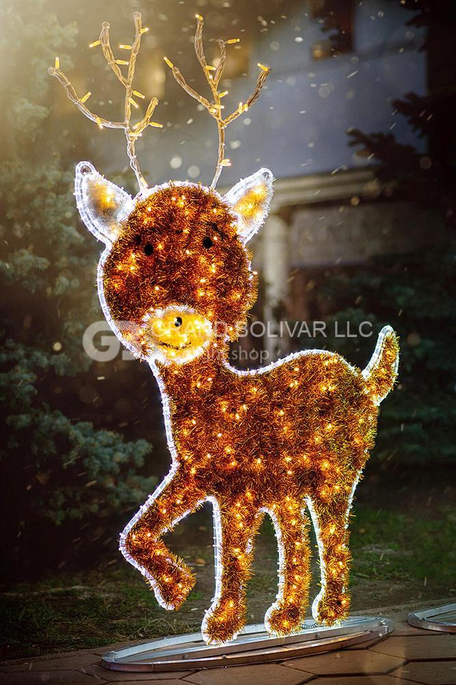 2. 2D фігура з мішурою. Такі олені виглядають дуже симпатично і мило. Вони дуже гармонійно впишуться в будь-яку фотозону і стануть улюбленцями для селфі в інстаграм. Така фігура не просто світиться, але й розкидає навколо чудові відблиски, що відбиваються від сотень ворсинок мішури.