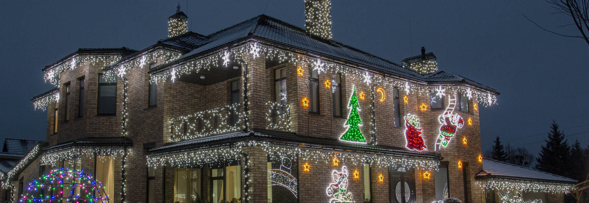 Новорічне прикрашання приватних будинків та прибудинкових територій. Вуличні гірлянди, світлодіодні олені та інші декорації для дому.