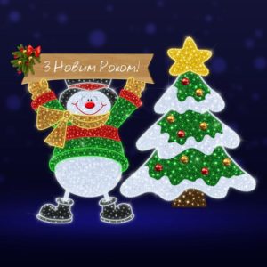 Світлодіодна фотозона "Сніговик з табличкою" Розміри : 2,40м х 1,80м Потужність: 129,1W Вага: 20 кг