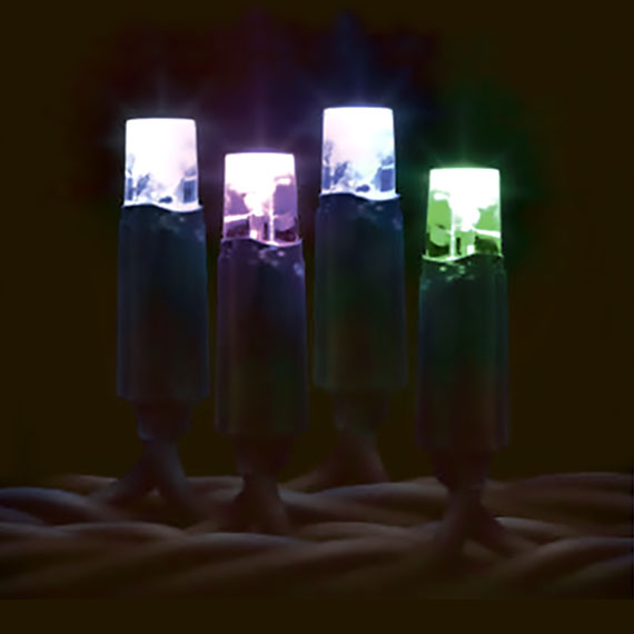 Гірлянда LED DECOLIGHT 23429.71 зібрана на чорному кабелі зі світлодіодами чотирьох різних кольорів: яскравого білого (холодного), рожевого, синього та зеленого.