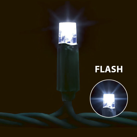 Гірлянда LED DECOLIGHT 23120.04F зібрана на темно-зеленому кабелі зі світлодіодами яскравого білого (холодного) кольору та світлодіодами-спалахами яскравого білого (холодного) кольору.