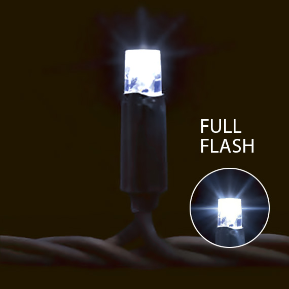 Гірлянда LED FULL FLASHING DECOLIGHT 23351.71FF зібрана на чорному кабелі зі світлодіодами-спалахами яскравого білого (холодного) кольору.