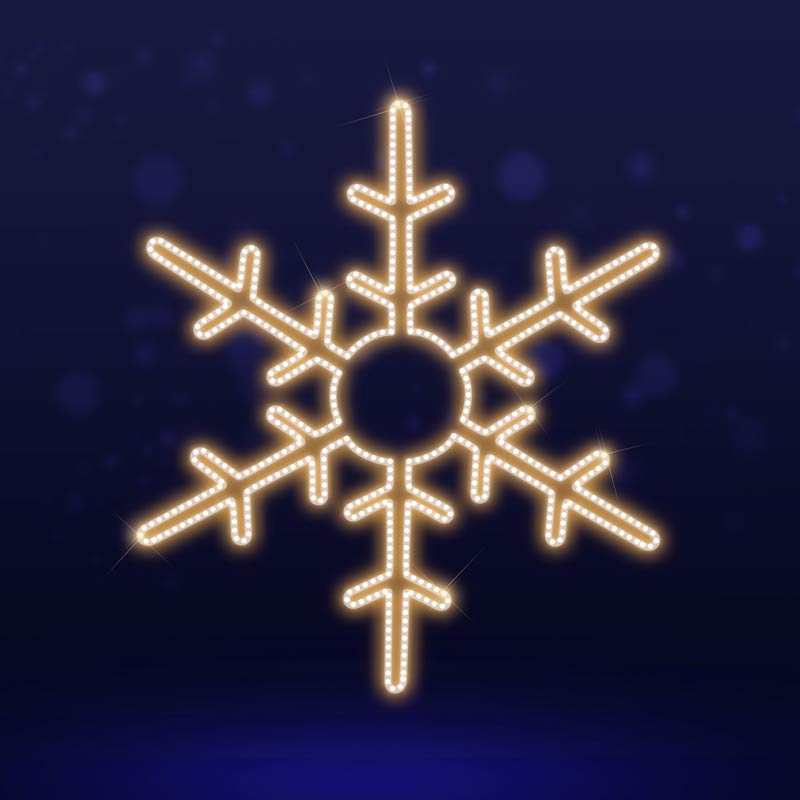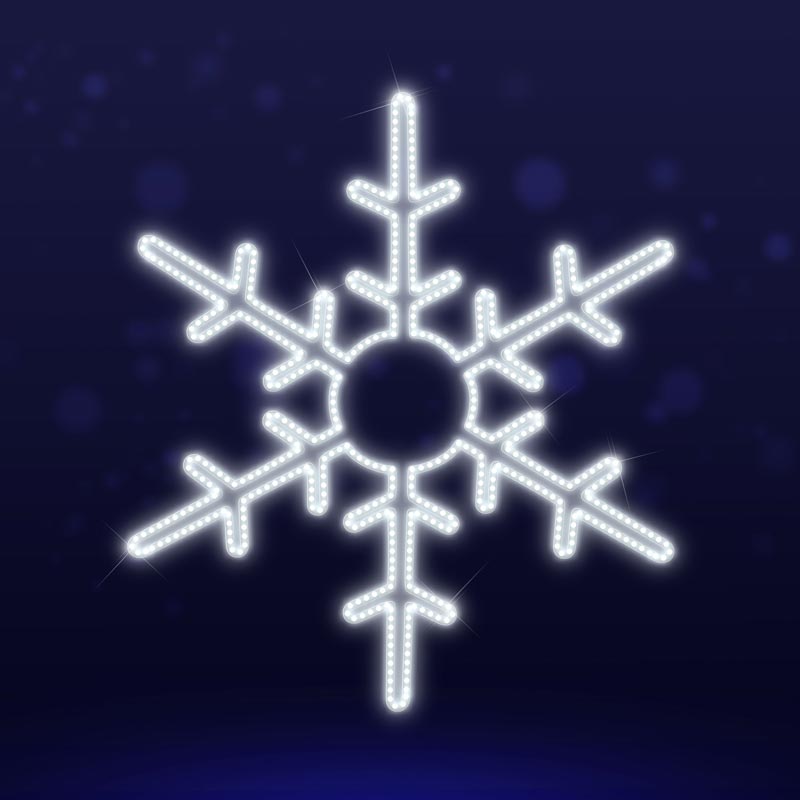 Світлодіодний мотив Сніжинка SF-001. Новорічні світлодіодні мотиви у формі сніжинок виготовлені на основі алюмінієвого каркасу у вигляді сніжинки, по контуру якого прикріплений світловий шнур дюралайт. Також можуть використовуватися і інші світлодіодні гірлянди, такі як світловий ланцюжок LED DECOLIGHT, гнучкий неон, лампи та ін.