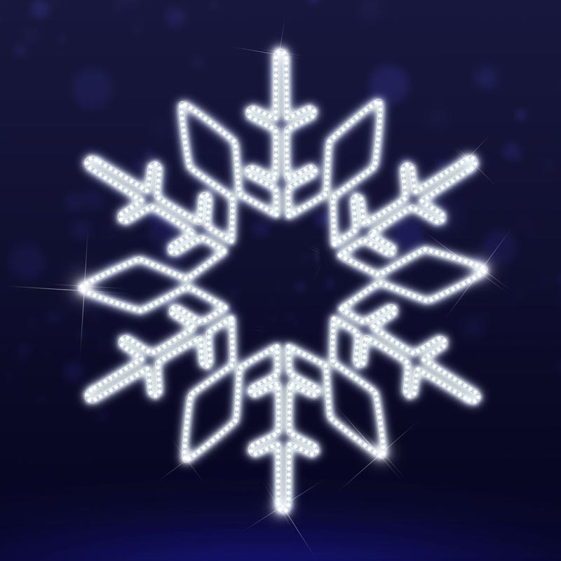 Світлодіодний мотив Сніжинка SF-011. Новорічні світлодіодні мотиви у формі сніжинок виготовлені на основі алюмінієвого каркасу у вигляді сніжинки, по контуру якого прикріплений світловий шнур дюралайт. Також можуть використовуватися і інші світлодіодні гірлянди, такі як світловий ланцюжок LED DECOLIGHT, гнучкий неон, лампи та ін.