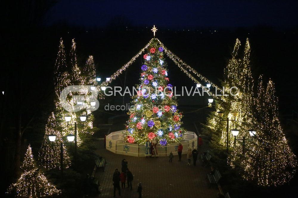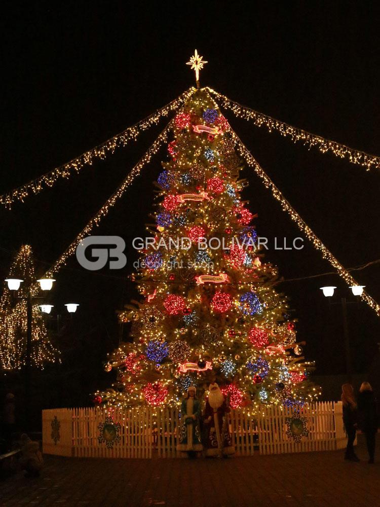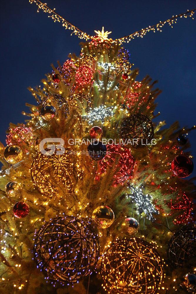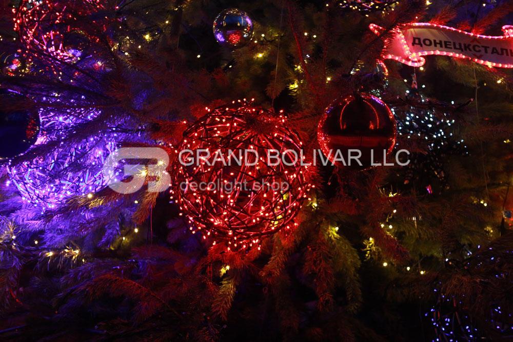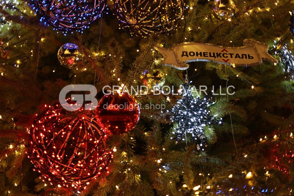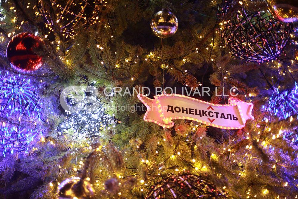 Елка выстой 11 метров украшена объемными игрушками (3D мотивами) – светодиодными сферами и звездами. Для украшения ели было изготовлено более 100 световых мотивов. Светодиодные шары и звезды изготавливались в трех размерах. Это делалось для того, чтоб светодиодные игрушки пропорционально и красиво смотрелись на разной высоте елки (и на нижнем и на верхнем радиусе ели). Также, ель украшена световой цепочкой IP67 LED DECOLIGHT с эффектом мерцания. На верхушку установили рождественскую 3D звезду, от которой расходились лучи светодиодной гирлянды LED ICELIGHT 3х0,5м теплого белого цвета с холодным мерцанием.