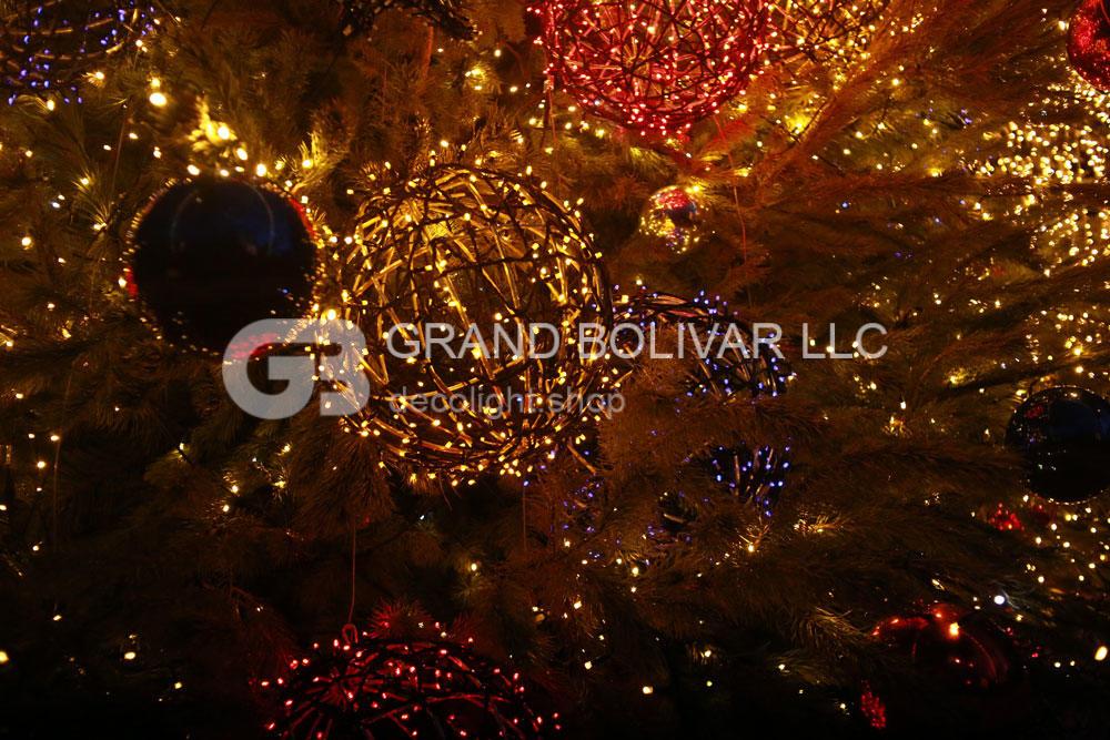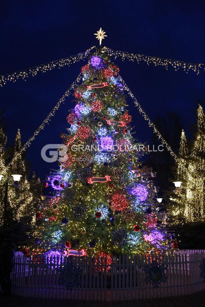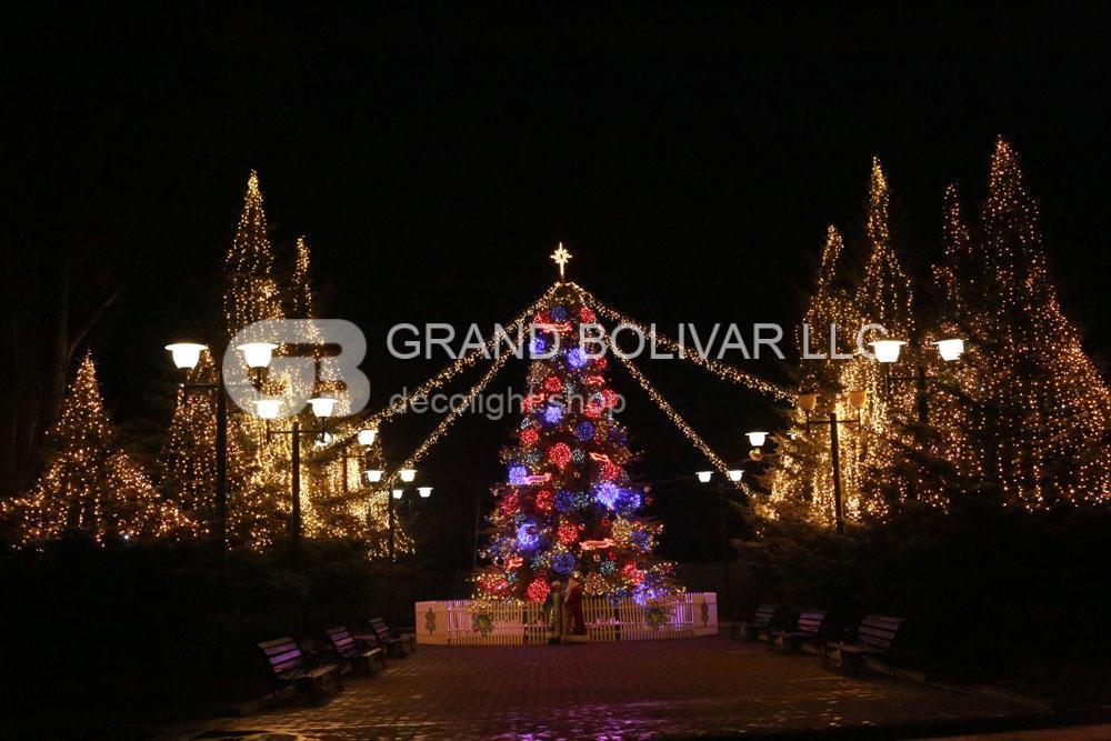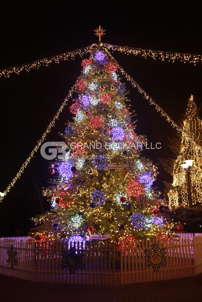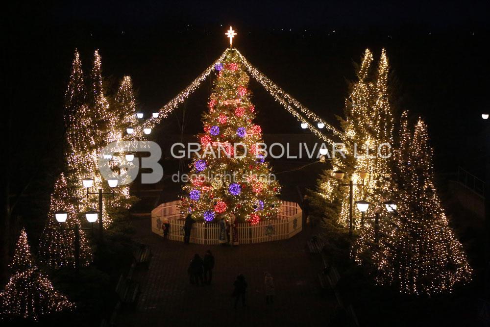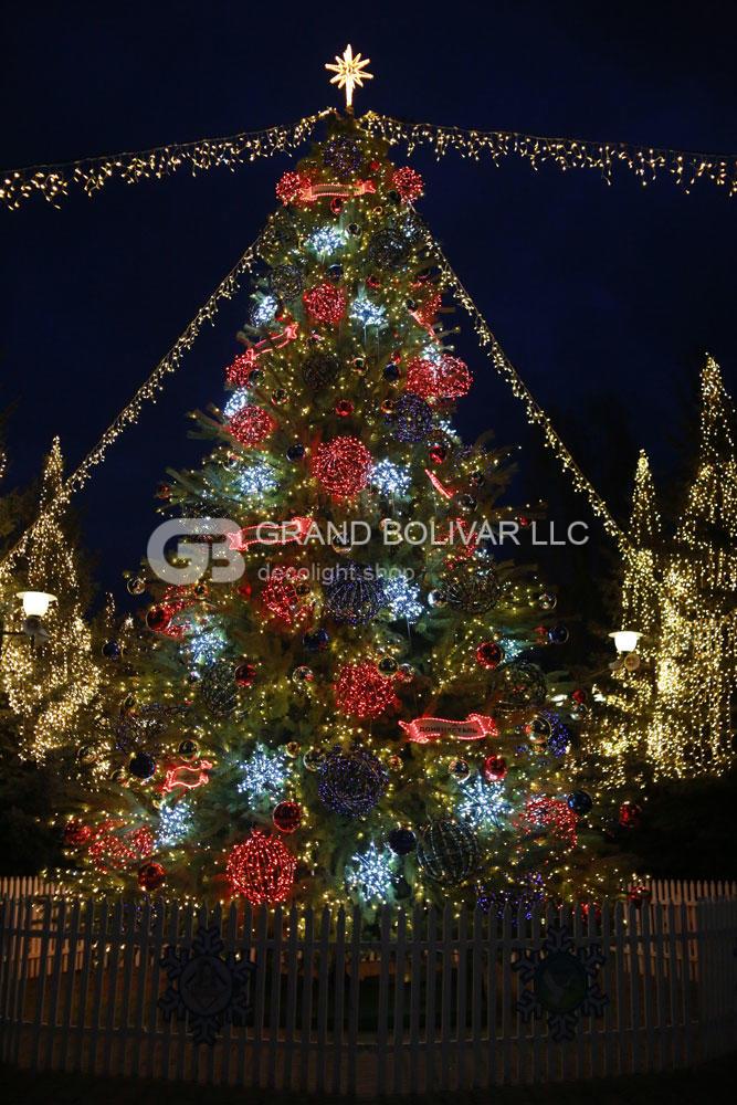 Елка выстой 11 метров украшена объемными игрушками (3D мотивами) – светодиодными сферами и звездами. Для украшения ели было изготовлено более 100 световых мотивов. Светодиодные шары и звезды изготавливались в трех размерах. Это делалось для того, чтоб светодиодные игрушки пропорционально и красиво смотрелись на разной высоте елки (и на нижнем и на верхнем радиусе ели). Также, ель украшена световой цепочкой IP67 LED DECOLIGHT с эффектом мерцания. На верхушку установили рождественскую 3D звезду, от которой расходились лучи светодиодной гирлянды LED ICELIGHT 3х0,5м теплого белого цвета с холодным мерцанием.