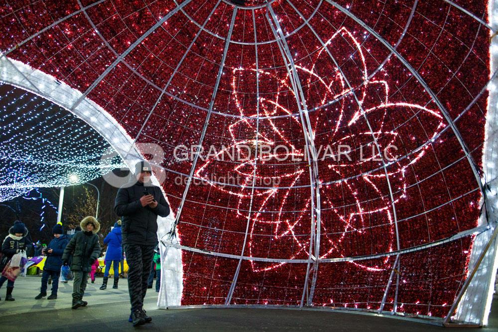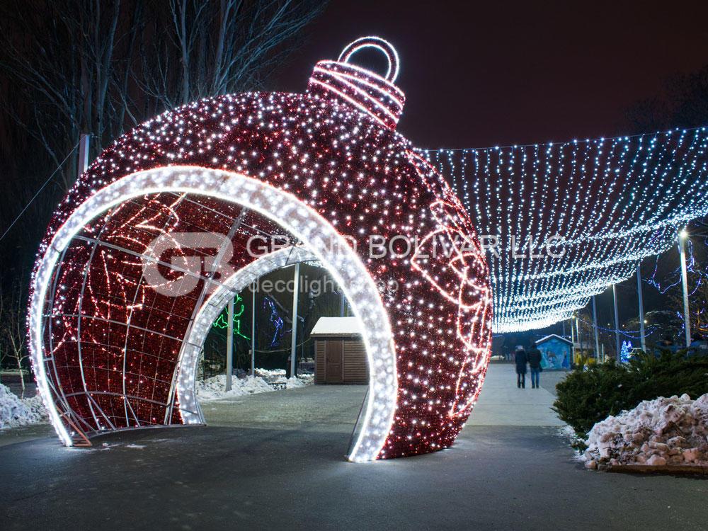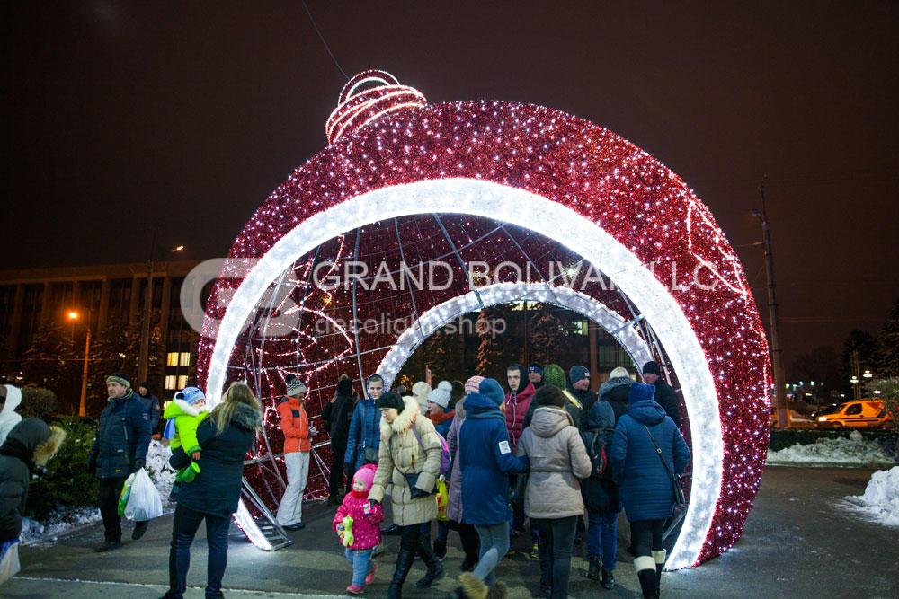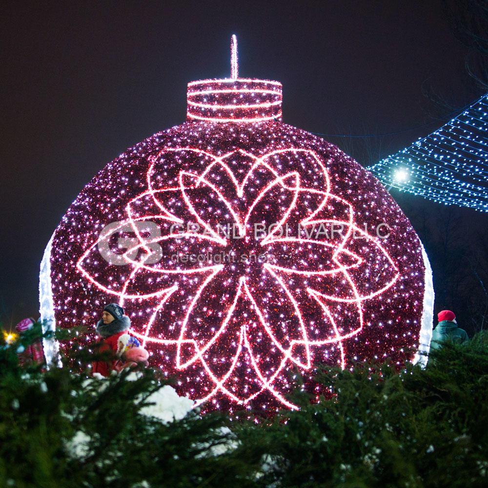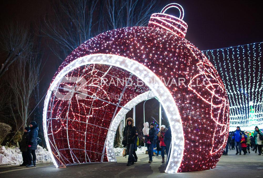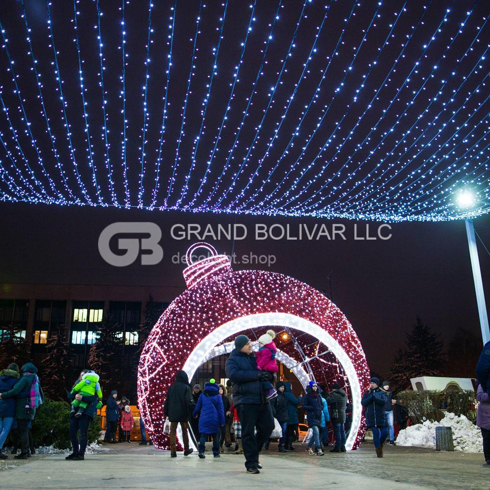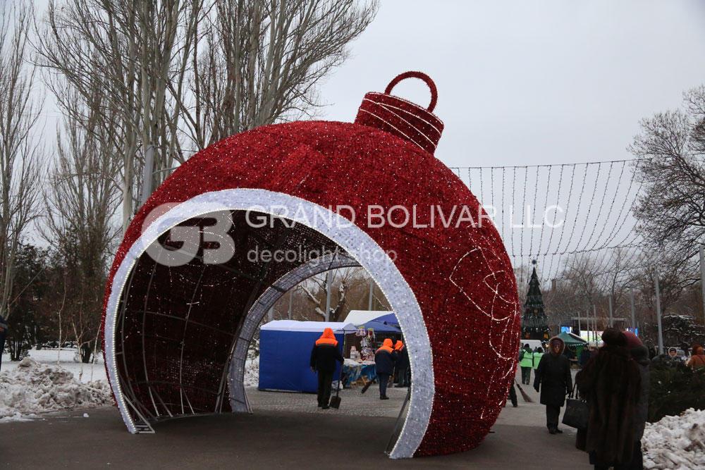 Найбільша світлодіодна ялинкова куля виготовлена з алюмінієвого каркаса, прикрашена світлодіодними гірляндами і ялинковою мішурою. Вона вдає із себе світлову об’ємну арку у формі усіченої сфери з можливістю наскрізного безперешкодного проходу.
