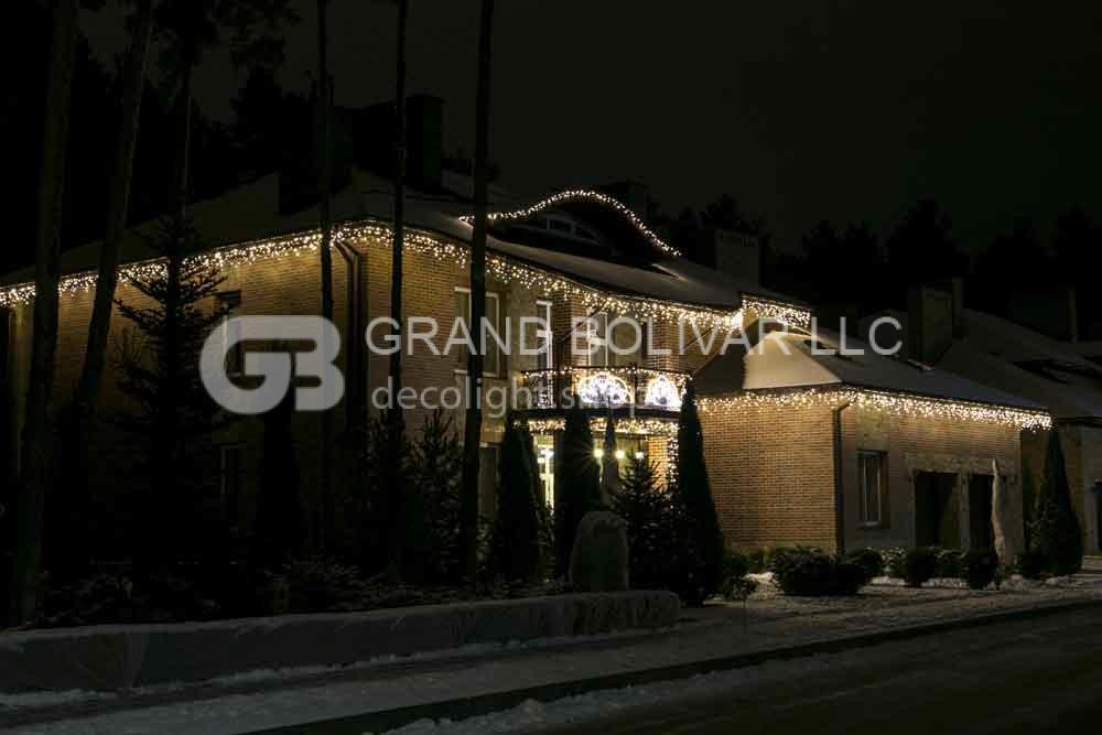 В новогоднем украшении загородного дома использован световой декор и светодиодные гирлянды в теплом белом свечении.