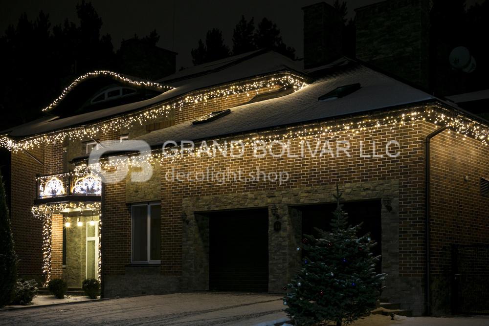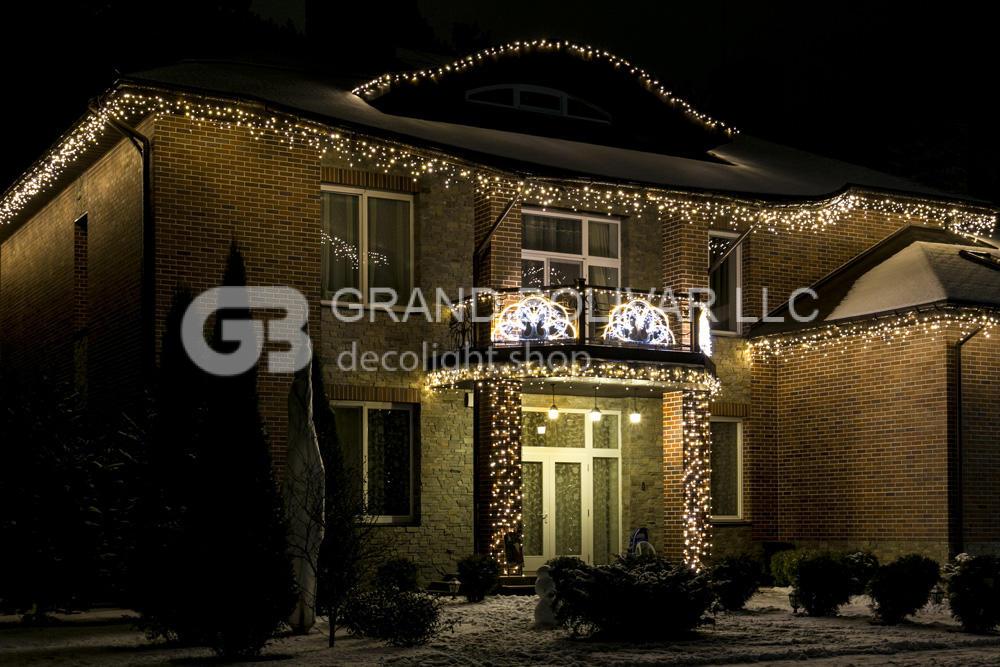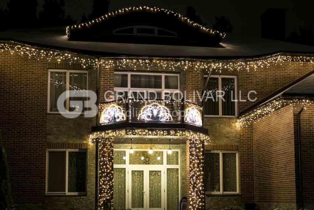 Периметр крыши дома и гаража украшен светодиодной гирляндой LED ICELIGHT. Основной акцент новогоднего оформления делался на входную группу. На балкон установили декоративные световые мотивы, которые были выполнены по индивидуальному заказу на нашем производстве. Колонны украшены гирляндами-цепочками LED DECOLIGHT.