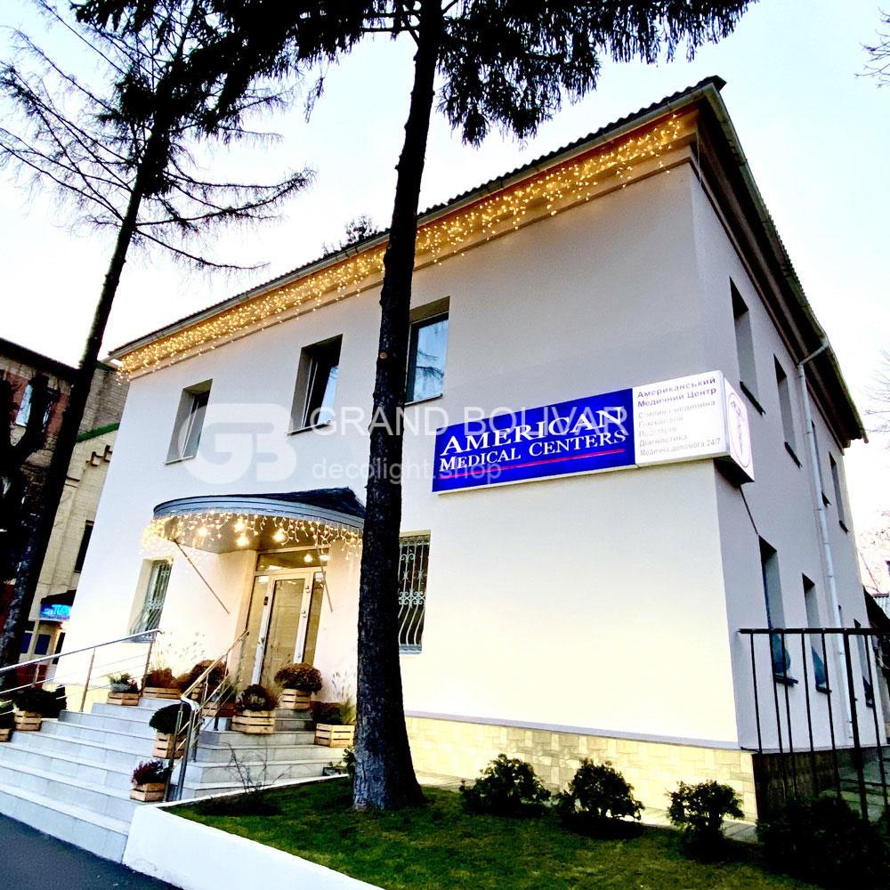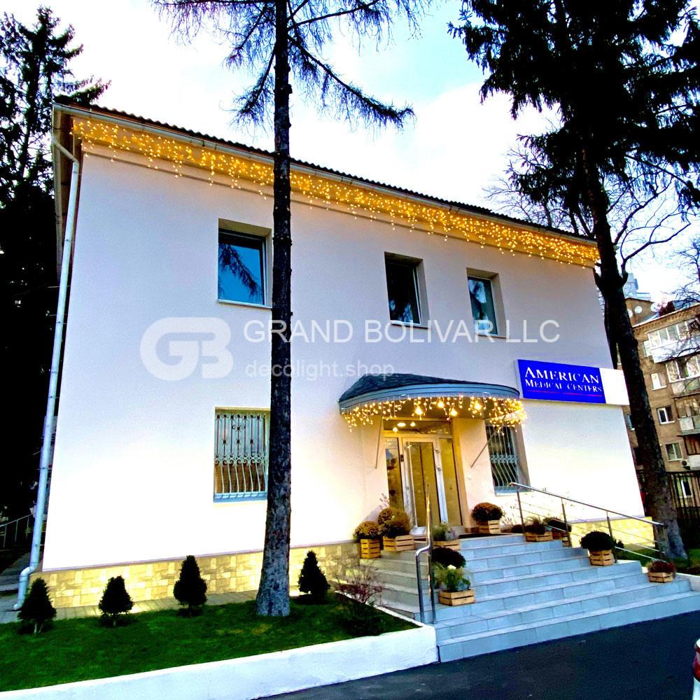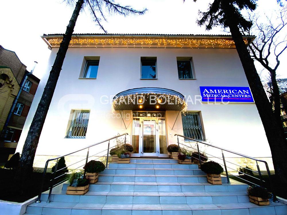 В этом году новогоднее оформление фасада American Medical Centers в г.Киев освежили новой праздничной иллюминацией. Иллюминация фасада выполнена в теплых цветах, с использованием фигурной гирлянды (бахрома) LED ICELIGHT тепло-белого цвета. Для декорирования входной группы здания были использованы LED ICELIGHT 3 х 0,5м., для украшения периметра крыши использовали гирлянды LED ICELIGHT 3 х 0,9м.