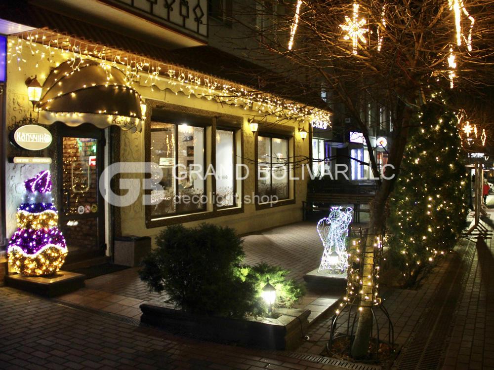 В новогоднем оформлении фасадов все большую популярность получают дизайнерские эксклюзивные фигуры из мишуры и гирлянд. Конечно, же мы спроектировали и изготовили в нужных размерах светодиодную конструкцию в виде десерта и установили ее у входа в кафе.