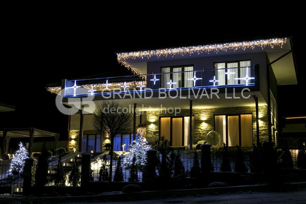 Козирок вхідної групи прикрашають світлодіодні гірлянди-бурульки LED ICELIGHT теплого-білого світіння.На скляній частині балкона розміщені світлодіодні мотиви зірки. Вийшло стильно, яскраво, і, одночасно, стримано!