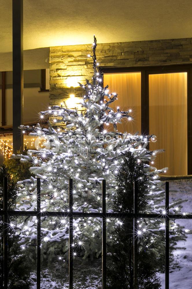 Новорічне оформлення приватного будинку доповнено прикрашанням двох ялинок у дворі. Ялинки прикрашені світловими ланцюжками LED FLASHING DECOLIGHT в холодному світінні з ефектом мерехтіння.