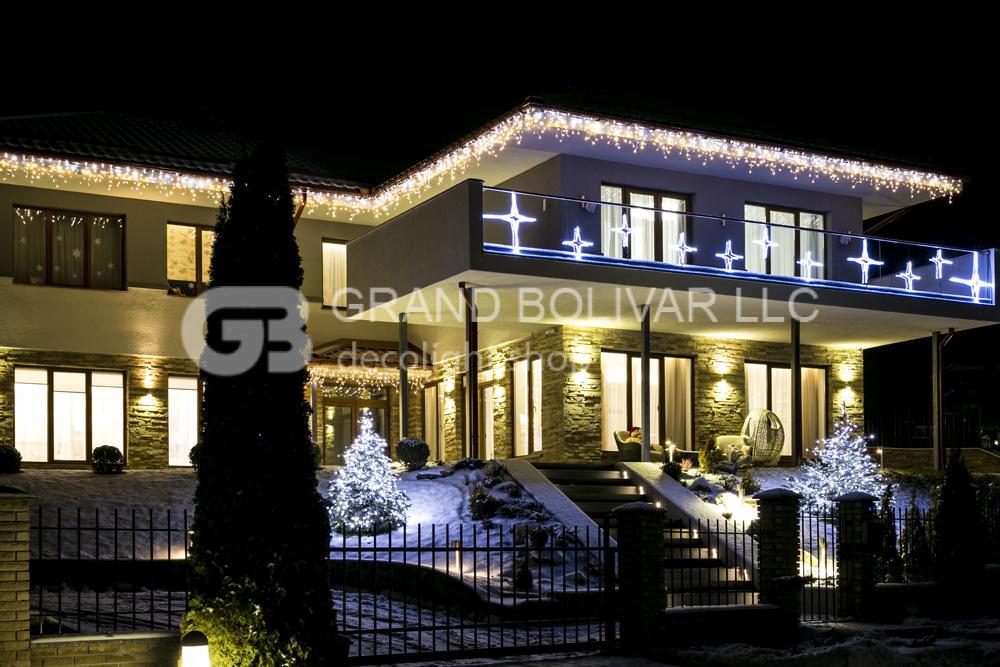 Професійне новорічне оформлення заміського будинку не обходиться без оригінального світлового рішення. Дизайнер розробив загальну концепцію оздоблення будинку і прилеглої території. Новорічне оформлення котеджу виконано за допомогою світлодіодної нитки LED FLASHING DECOLIGHT холодного кольору і гірлянд у вигляді бахроми LED FLASHING ICELIGHT теплого кольору, які підкреслюють контур даху. Поєднання цих двох кольорів – це модний тренд у новорічному оформленні.