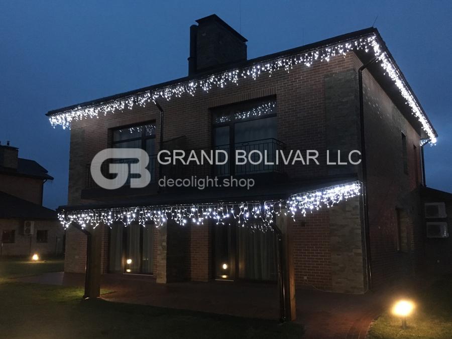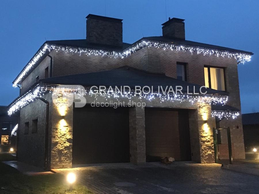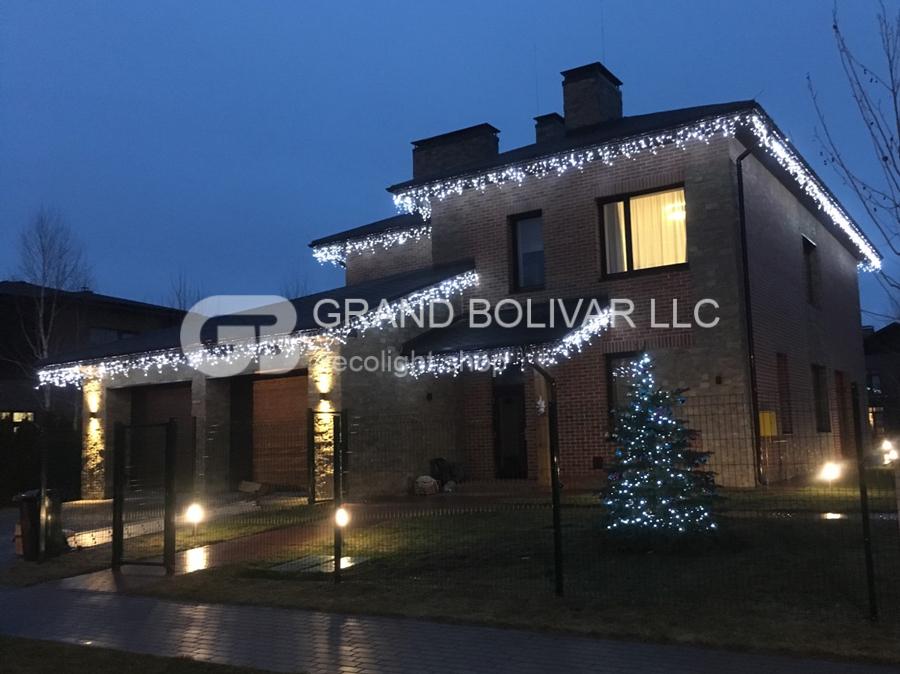 Основний будинок по периметру даху освітлений світлодіодним гірляндою ICELIGHT 3х0,5м (фігурна завіса, рвана штора, Icicle) в холодно білому кольорі. Ялина прикрашена за допомогою світлодіодного ланцюжка LED DECOLIGHT такого-ж холодного білого кольору.