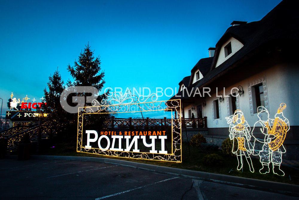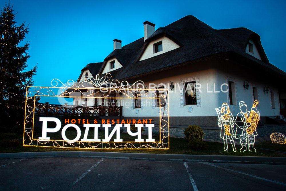 Праздничная иллюминация с каждым годом становится все ярче, красочней, многообразней. Дизайнерские идеи становятся все смелее и необычней. Праздничная иллюминация ресторанно-гостиничного комплекса РОДИЧИ требовала творческого и неординарного подхода в разработке проекта. Нужно было придумать оформление, которое бы привлекало внимание и при этом не затрагивало фасад ресторана. Для такого варианта идеально подходят светодиодные фигуры и светодиодные фотозоны.