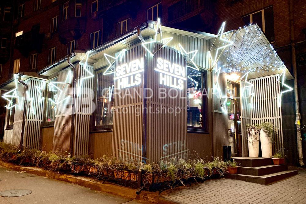 Для создания яркой, праздничной иллюминации светодиодный декор выбрали холодного белого свечения. Холодные оттенки делают фасад ресторана более выразительным на фоне других фасадов. Оформление фасада ресторана Seven Hills, как и предполагалось, получилось оригинальным и броским. Оно радовало гостей в праздничный период и продолжает дарить хорошее настроение и сегодня. Свяжитесь с нами, чтобы заказать праздничную иллюминацию для своего ресторана или узнать более подробную информацию удобным для вас способом из раздела контакты.