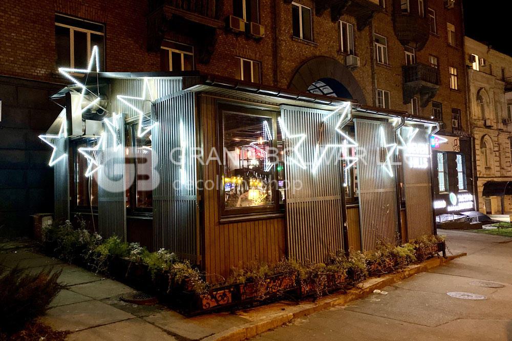 Задача стояла создать оригинальное световое оформление, которое использовалось бы не только в праздничный период, но и далее на постоянной основе. Главными элементами декора выступают звезды разных размеров, которые размещены по всему фасаду. «Изюминка» оформления в том, что звезды размещены не плоскостью к фасаду, а ребрами. Таким образом создаётся 3D эффект.