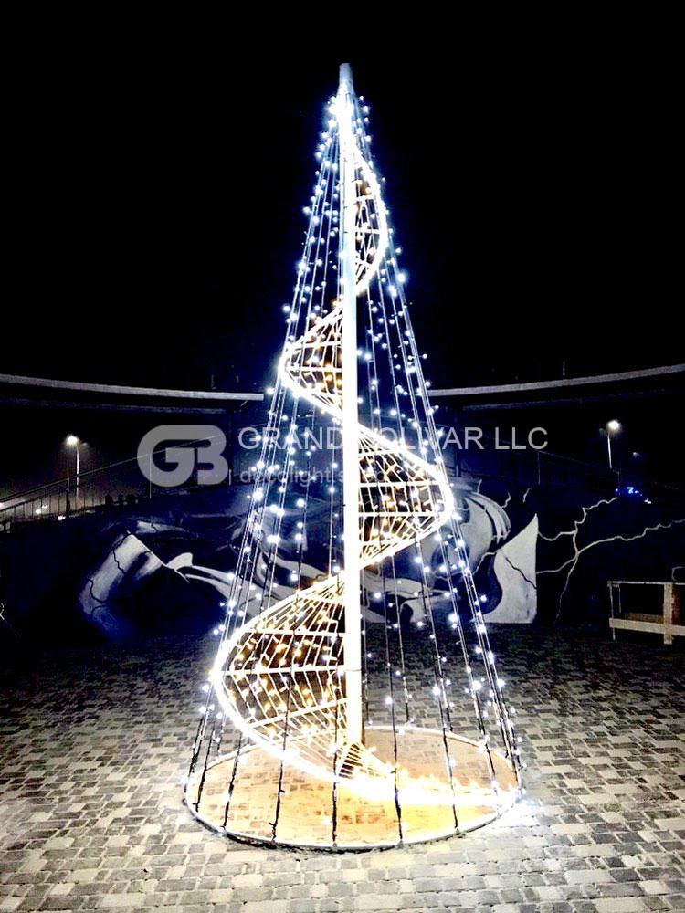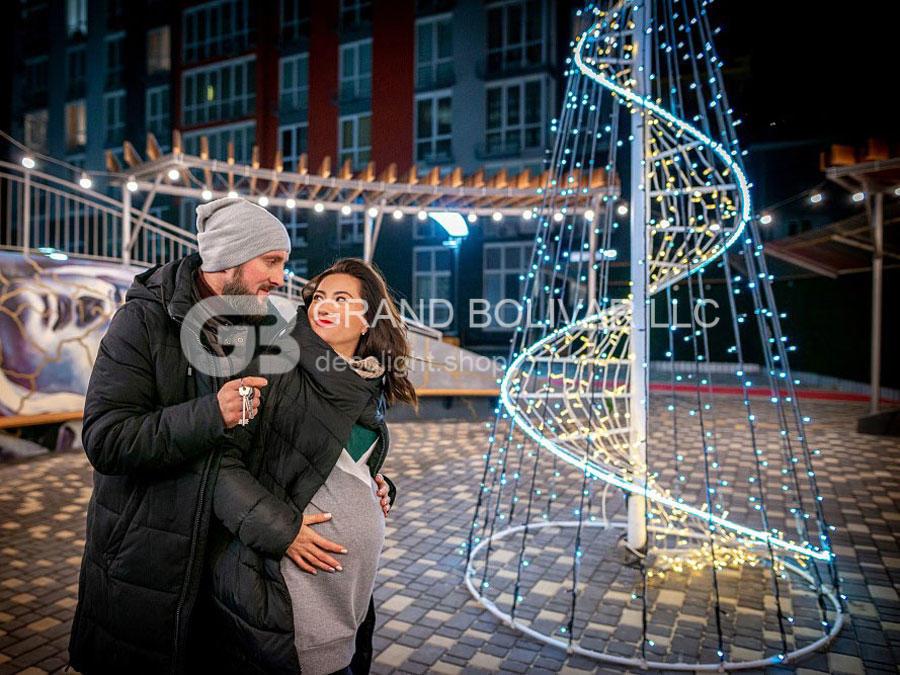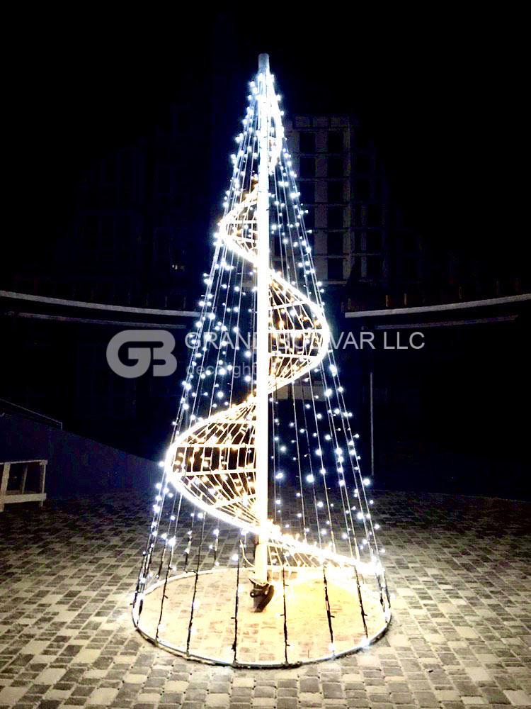 Красивая, стильная и необычная светодиодная ель-конус была изготовлена для ЖК ARTVILLE г. Одесса. Каркас елки изготовлен из черного металла и окрашен порошковой краской в белый цвет. Высота ели 4 метра, нижний диаметр 1,9м. Для изготовления ели использовались следующие светодиодные гирлянды: гирлянда LED DECOLIGHT, гирлянда LED ROPELIGHT и гирлянда водопад LED Waterfall.