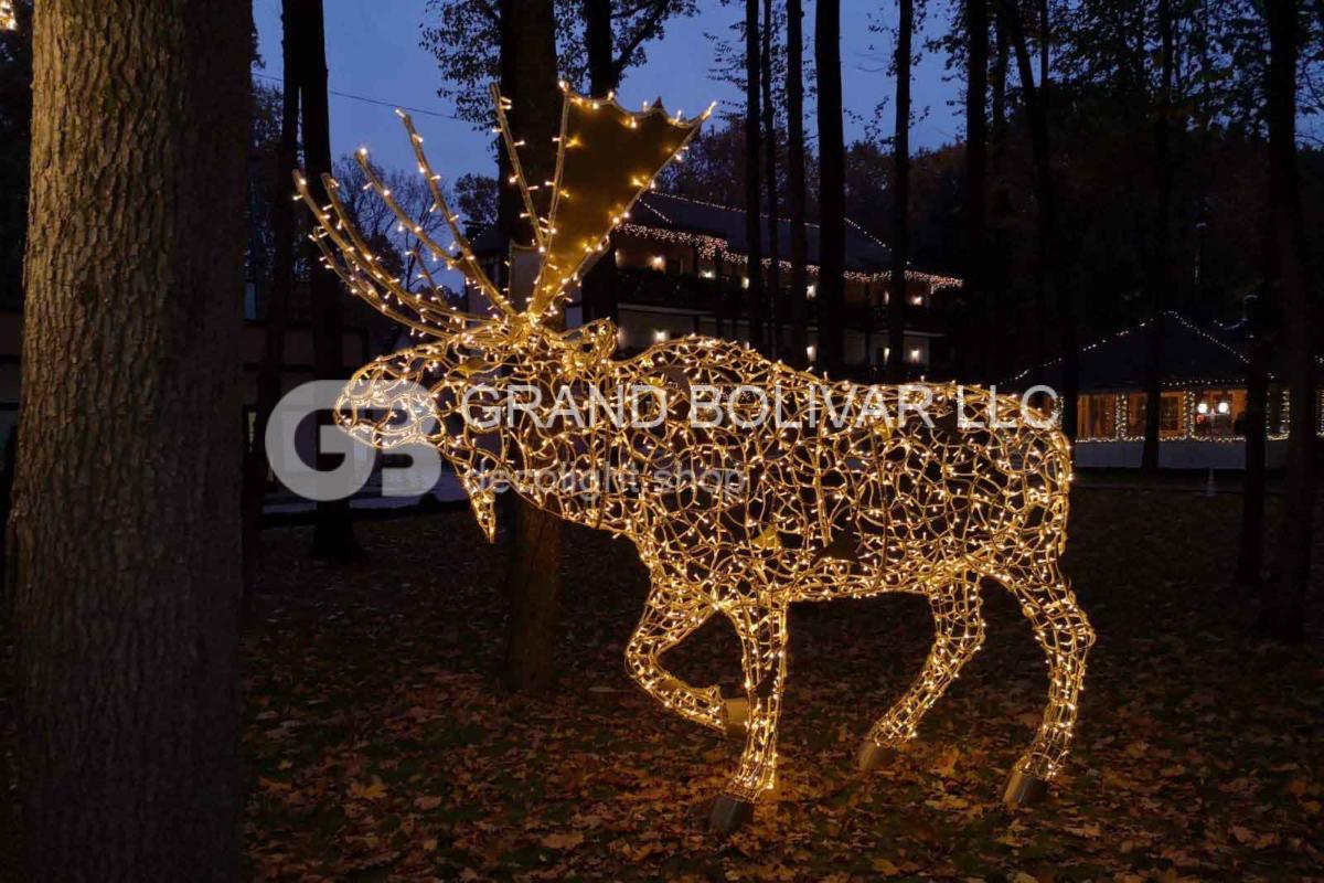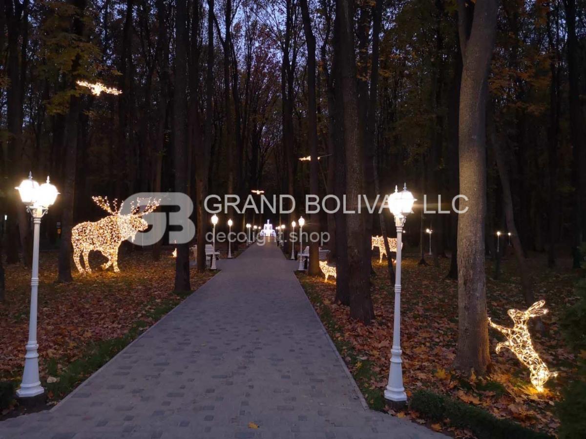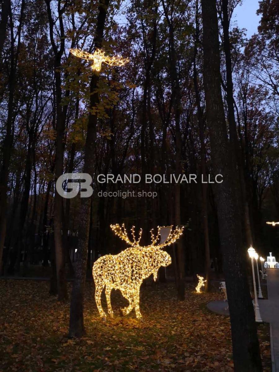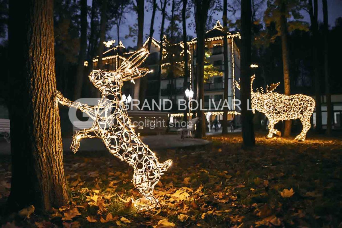 Светодиодные фигуры животных очень гармонично вписались в парк комплекса ZASTAVA. Среди деревьев разместились зайцы, лисицы, лось и лосиха, а между деревьями летающие совы. В 2019г. на соседней поляне была размещена семья оленей, а этом году в сказочном лесу появились новые жители леса. Световые фигуры сделаны из алюминиевого каркаса, который окрашен в золотистый цвет и очень хорошо отражает свечение теплых диодов. Светодиодные гирлянды с высокой степенью защиты IP67, работают в любую погоду.