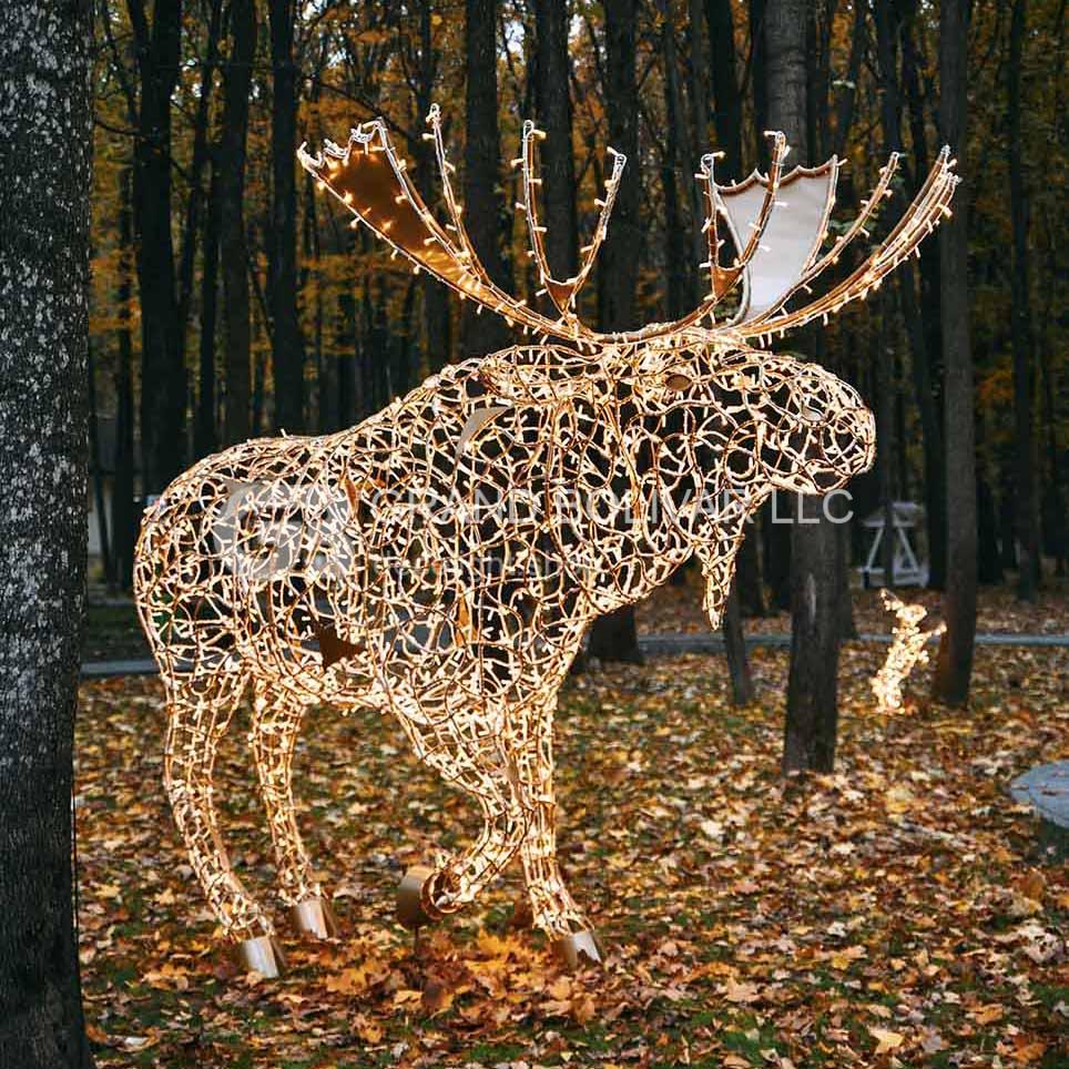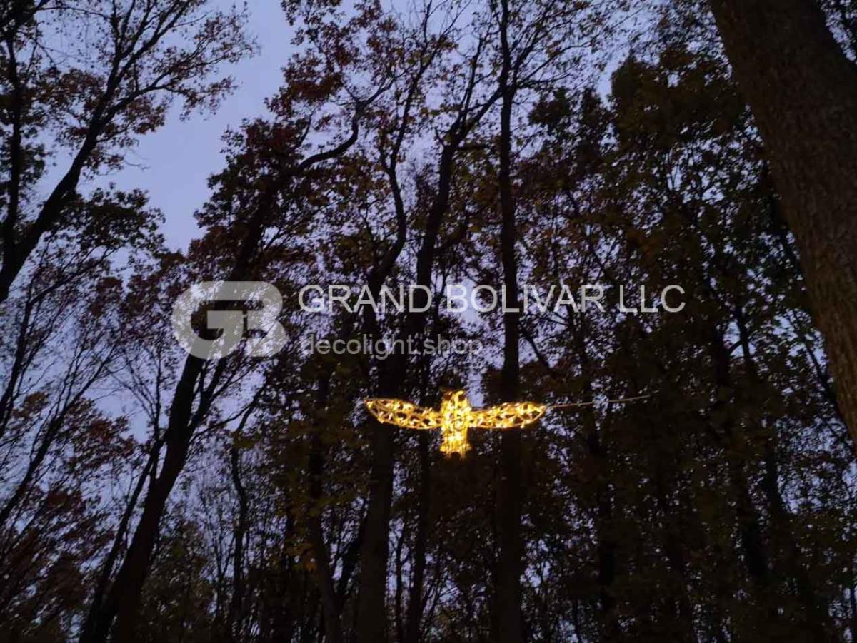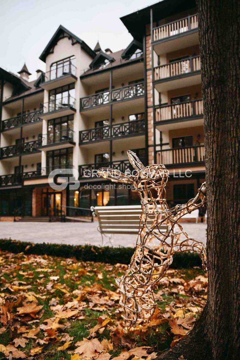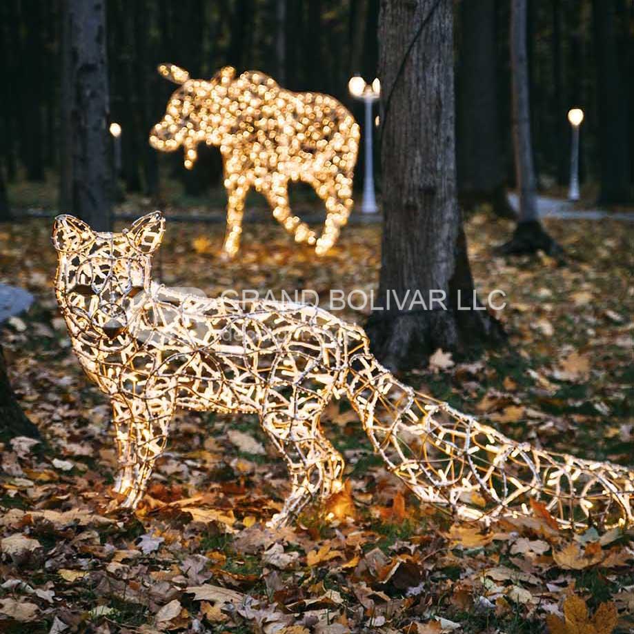 Светодиодные фигуры животных очень гармонично вписались в парк комплекса ZASTAVA. Среди деревьев разместились зайцы, лисицы, лось и лосиха, а между деревьями летающие совы. В 2019г. на соседней поляне была размещена семья оленей, а этом году в сказочном лесу появились новые жители леса. Световые фигуры сделаны из алюминиевого каркаса, который окрашен в золотистый цвет и очень хорошо отражает свечение теплых диодов. Светодиодные гирлянды с высокой степенью защиты IP67, работают в любую погоду.