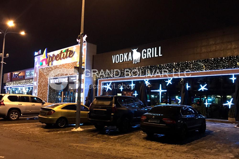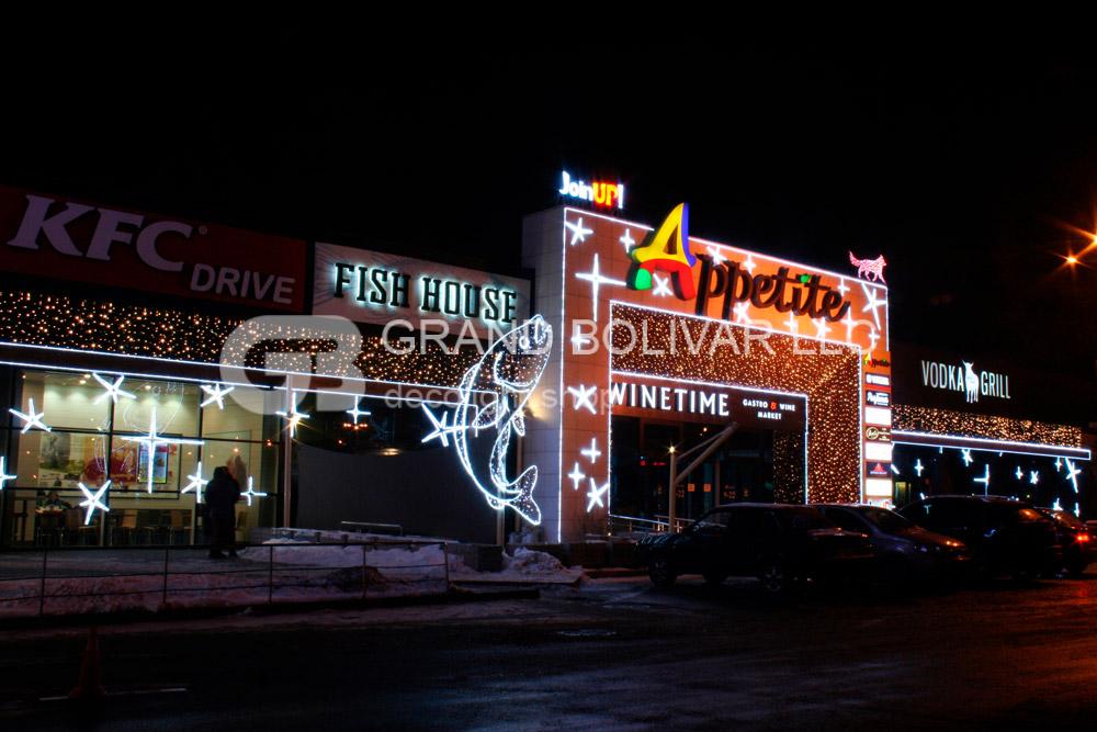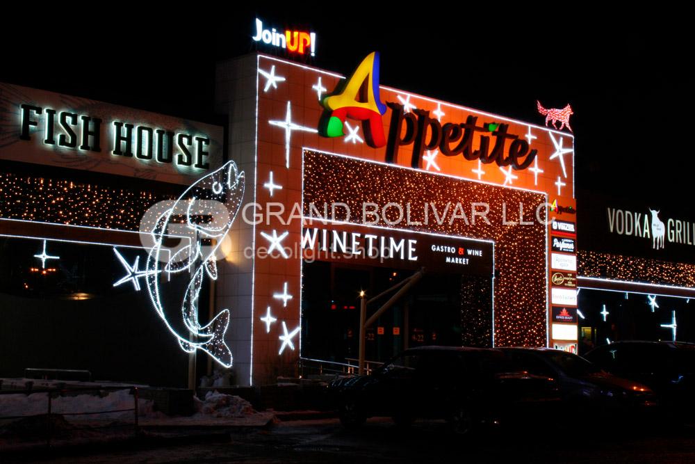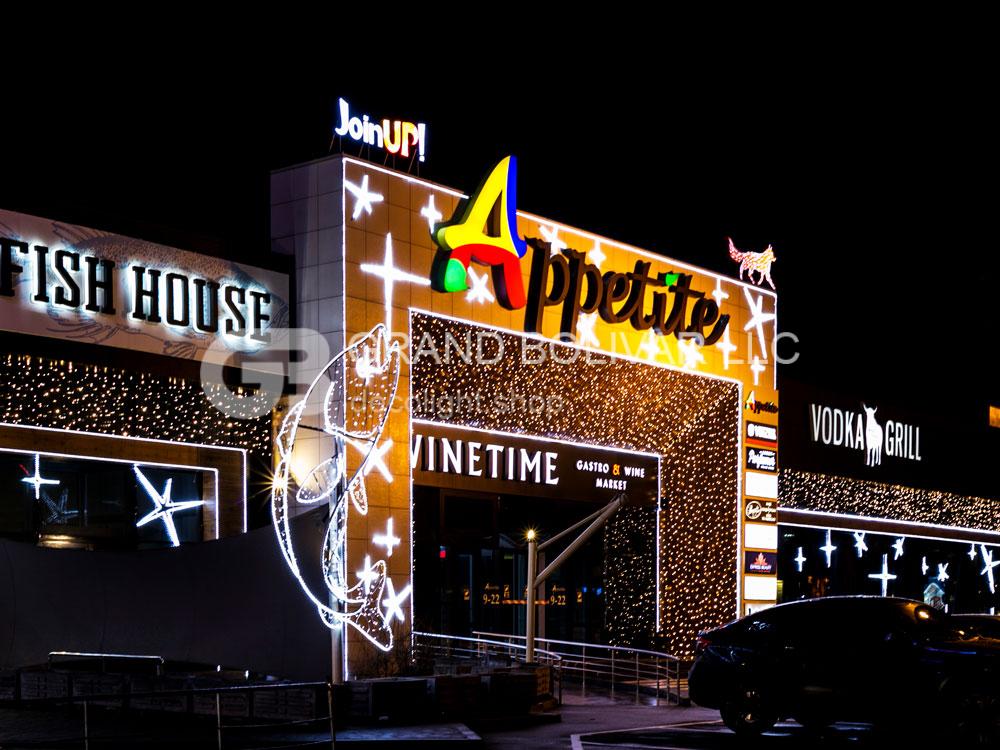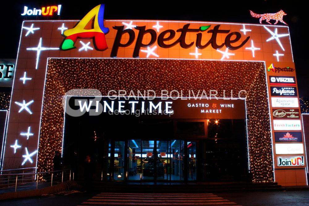Святкова ілюмінація фасаду ТЦ Appetite виконана в двох кольорах – теплий білий і холодний білий. Поєднання цих двох кольорів – це модний тренд у святковій ілюмінації останніх кілька років.